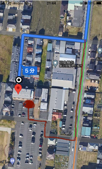 というわけで、当店へお越しの際は、下の写真にあります赤色の線のルートで、笠松運動公園の駐車場を目掛けてお越しいただきますようお願いいたします。